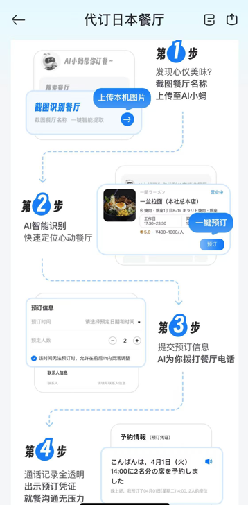 马蜂窝AI旅行助手“AI小蚂“同样新增三大关注旅行中细节需求的实用功能。日本餐厅很多需要预约,而语言障碍却曾让不少游客“头疼不已”,有了“AI代订日本餐厅”,用户只需截图心仪餐厅界面,AI将自动识别并提取餐厅名称、地址、营业时间及人均消费,在选定日期、人数及时段后,AI可直接拨打餐厅电话完成预订,全程无需用户参与沟通,预订成功的日文凭证实时同步至手机。